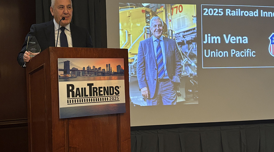 After accepting the Railroad Innovator of the Year award, Union Pacific Railroad CEO Jim Vena talked about how the UP-NS merger will divert traffic from trucks.Jeff StaglAs per usual at RailTrends, the speakers ranged from CEOs and high-ranking officers at the Class Is to short-line executives to Surface Transportation Board members to major association presidents to industry observers and analysts to movers and shakers from the rail supply sector.