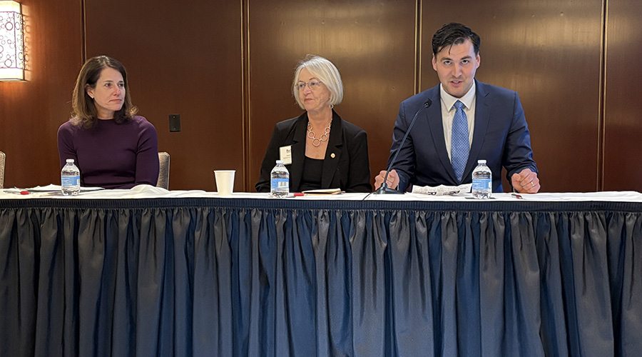 (From left) STB members Michelle Schultz and Karen Hedlund, and STB Chairman Patrick Fuchs. The board will “reach a thorough and fair decision” on the UP-NS merger application after it’s submitted, Fuchs said.Jeff StaglI’m not going to apologize for making your lives a bit harder soon. Don’t take the holidays off to get to a decision.