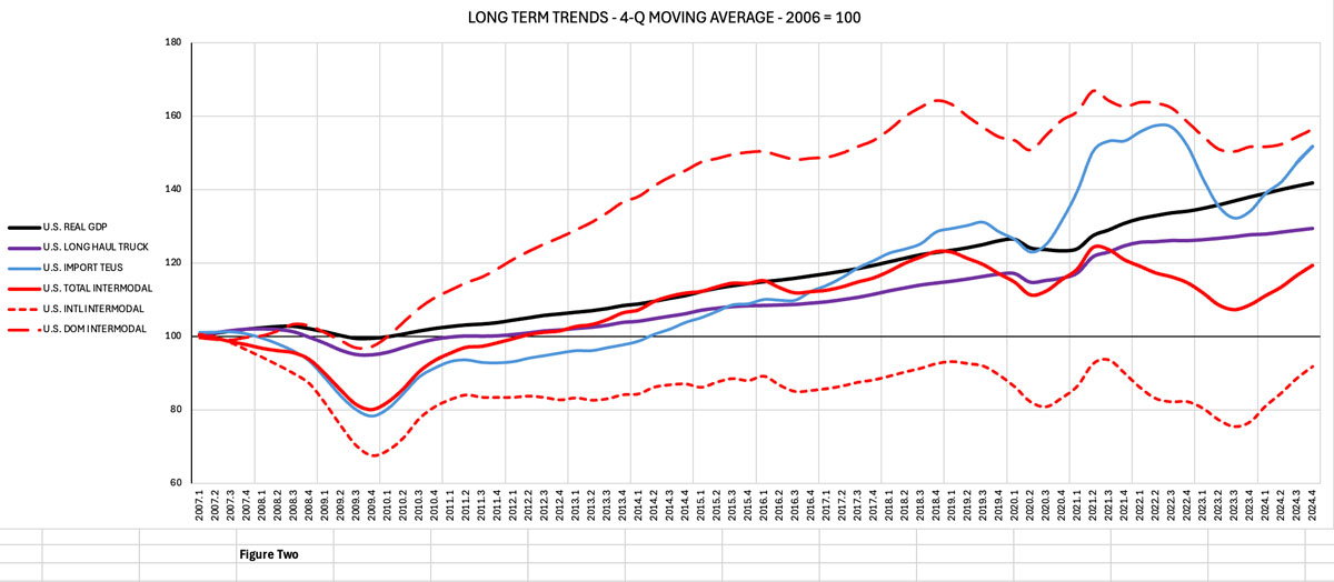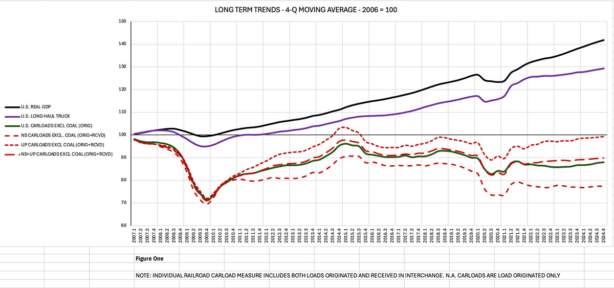 First, some historical context. Figure 1 compares long-term carload growth against a couple of benchmarks: U.S. real GDP and U.S. long-haul truckloads. The use of the real GDP figures knocks out the effects of inflation and gives us a true measure of the increase in economic activity over this time frame. The truck numbers are dry van and refrigerated truck moves of 500 or miles in length, as provided by Noel Perry of Transport Futures, a noted transportation economist and trucking expert. The carload figures are from the Association of American Railroads and cover carloads originated by the U.S. Big Four (BNSF Railway, Union Pacific Railroad, Norfolk Southern Railway and CSX) excluding coal (since the secular decline of that crucial commodity is beyond the industry’s control) and intermodal (which is treated separately later).