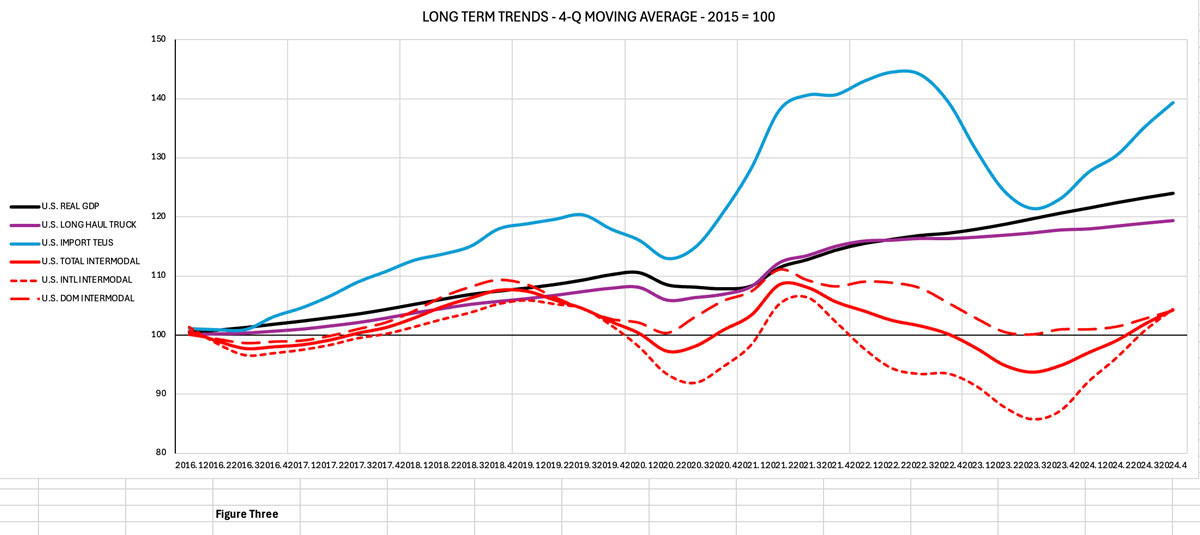 The good news is the performance of domestic intermodal — up 57% from 2006 to 2024, a CAGR of 2.5%. This far exceeded the growth in long-haul dry van and reefer truckloads. A true success story! However, there’s a catch. Most of the growth in domestic intermodal occurred during the “glory days,” prior to 2015. Since then, the volume story has become much more erratic. The problem is clearly displayed in Figure 3, which performs the same analysis as before, but with the year 2015 as the starting point.