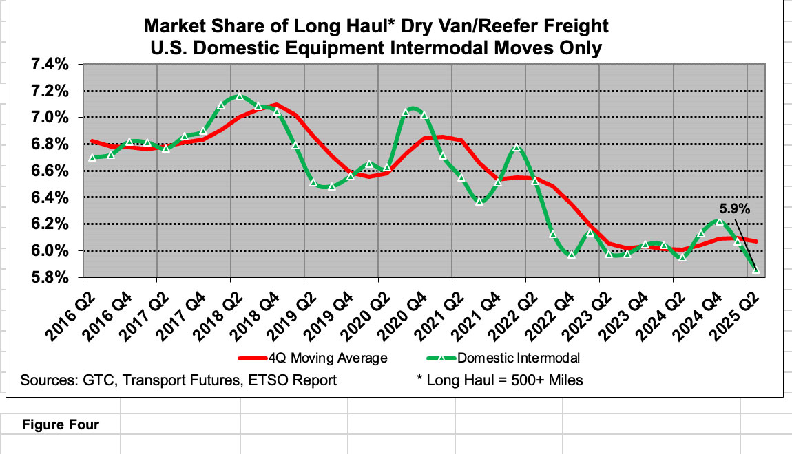 The situation is summarized by Figure 4, which displays my estimates for the share of U.S. long-haul movement of truck-type freight by domestic intermodal. This measure hit 5.9% in 2025 Q2 — the lowest point since 2011!
