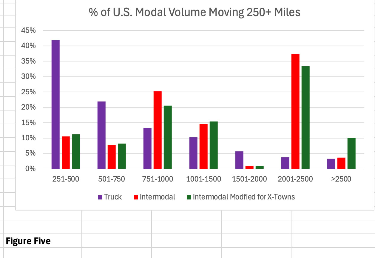 Figure 5 looks at the composition of U.S. truck and U.S. intermodal freight by mileage range for the year 2024. These are rough approximations. The truck numbers are from Transport Futures. The intermodal numbers are from IANA ETSO data, assuming one location per zone. For example, the length of haul for domestic loads moving between the Midwest and the Northeast is based on the highway miles between Chicago and New York City. Canadian and Mexican moves are excluded, simply because we don’t have good truck data for those markets.