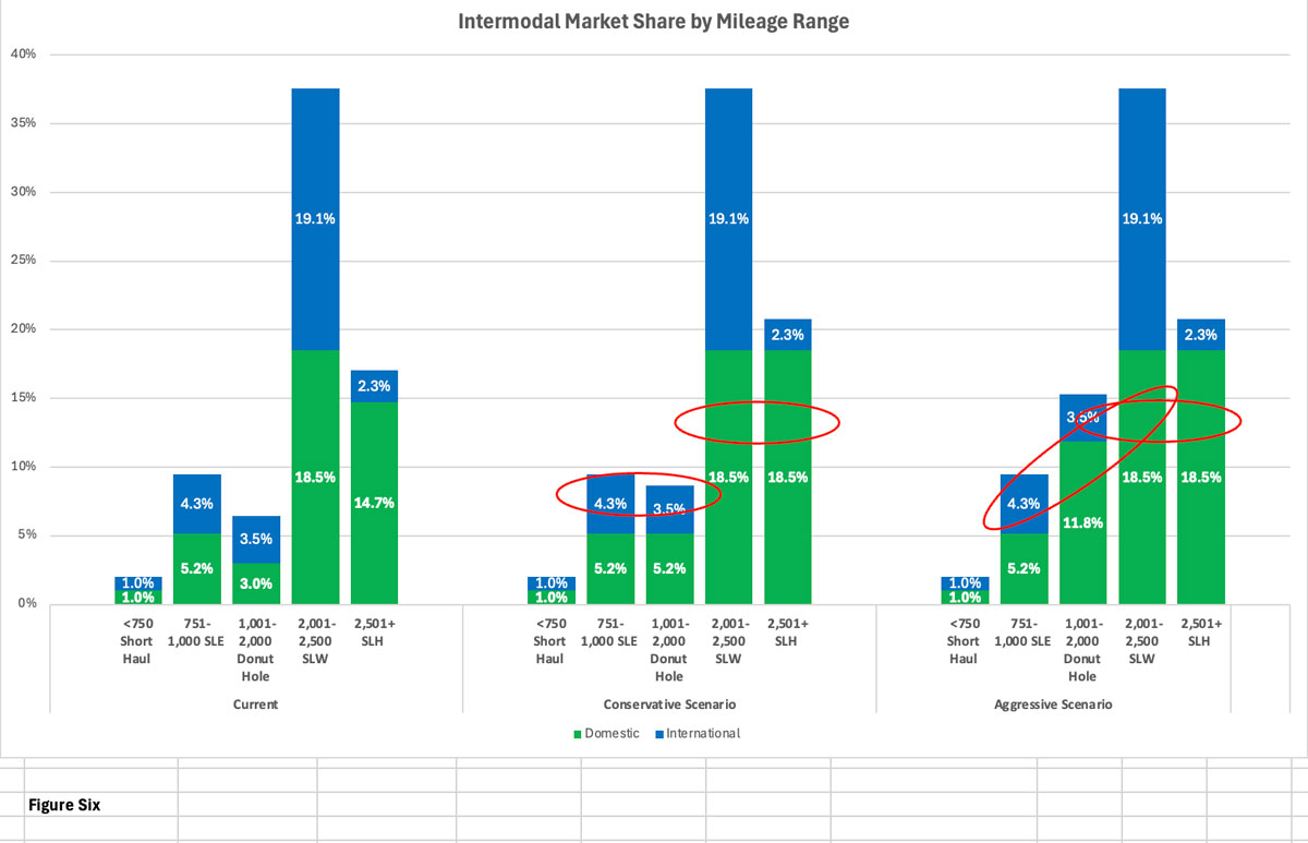 No hard data exists that defines how big the cross-town practice is, but after conversations with knowledgeable individuals, I have what I feel to be a good estimate. After adjusting the numbers to back out these effects, the shares of intermodal activity moving in the SLEH and SLWH ranges are lower and the share moving SLH is raised. Figure 6 translates these adjusted numbers into intermodal market share by mileage range. The current situation is on the left side of the graph.