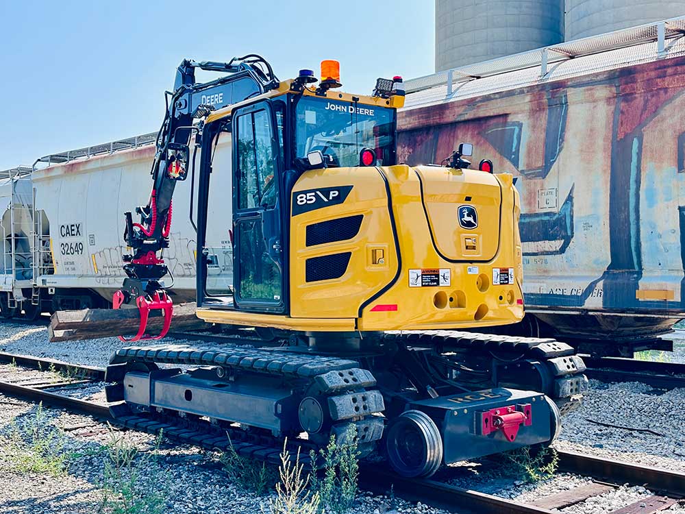 Featuring a John Deere excavator cab and base, the OTM Tracker has a reduced 5-foot tail swing radius to minimize the risk of fouling adjacent tracks, company officials said. The remote-controlled transfer system keeps operators on the ground during transfers; the OTM Tracker also climbs gondolas up to 12-and-a-half feet and handles 16-inch height differences between cars. It can distribute up to 2,000 ties per hour.